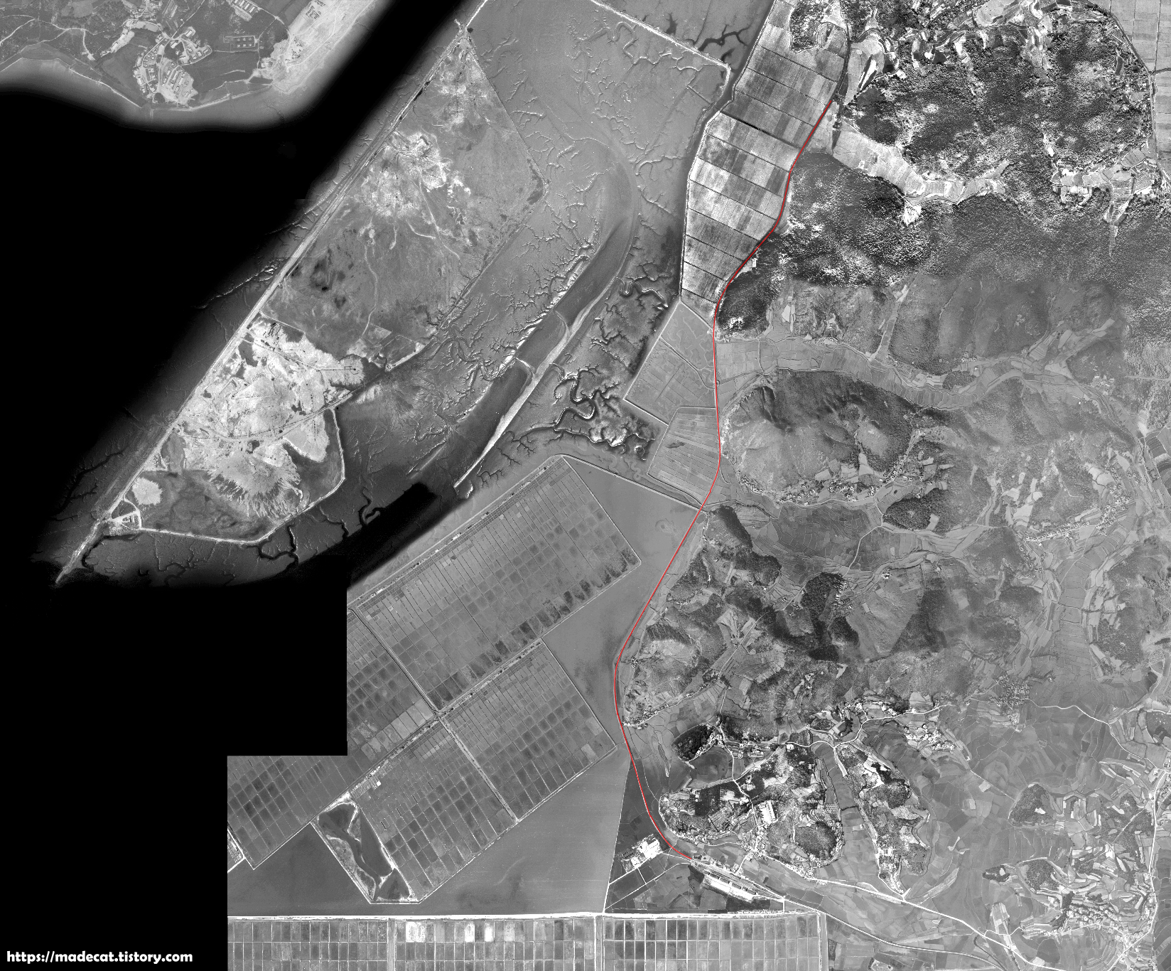 간척 이전 성포동 일대는 바다와 바로 마주한 곳이였기에, 수인선이 위쪽으로 크게 커브를 틀어 지나갔습니다.