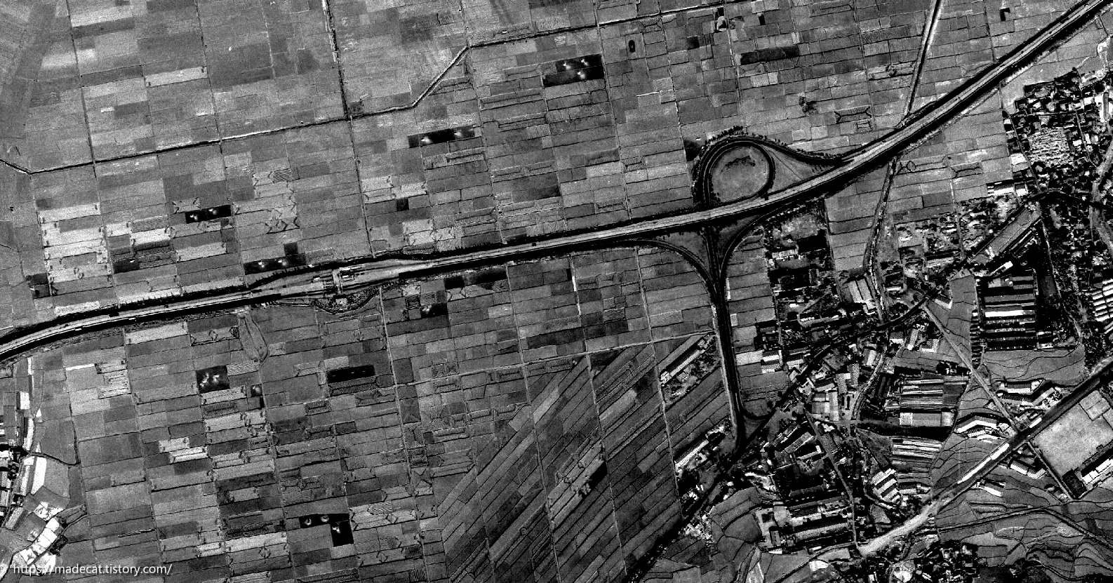 2차선 시절의 경부고속도로 위성사진입니다 사실 경부고속도로도 원래는 전구간 왕복 4차선으로 개통했죠 그러다가 80년대 후반부터 90년대 후반까지 확장공사하고 2000년대 중반에는 대전~대구