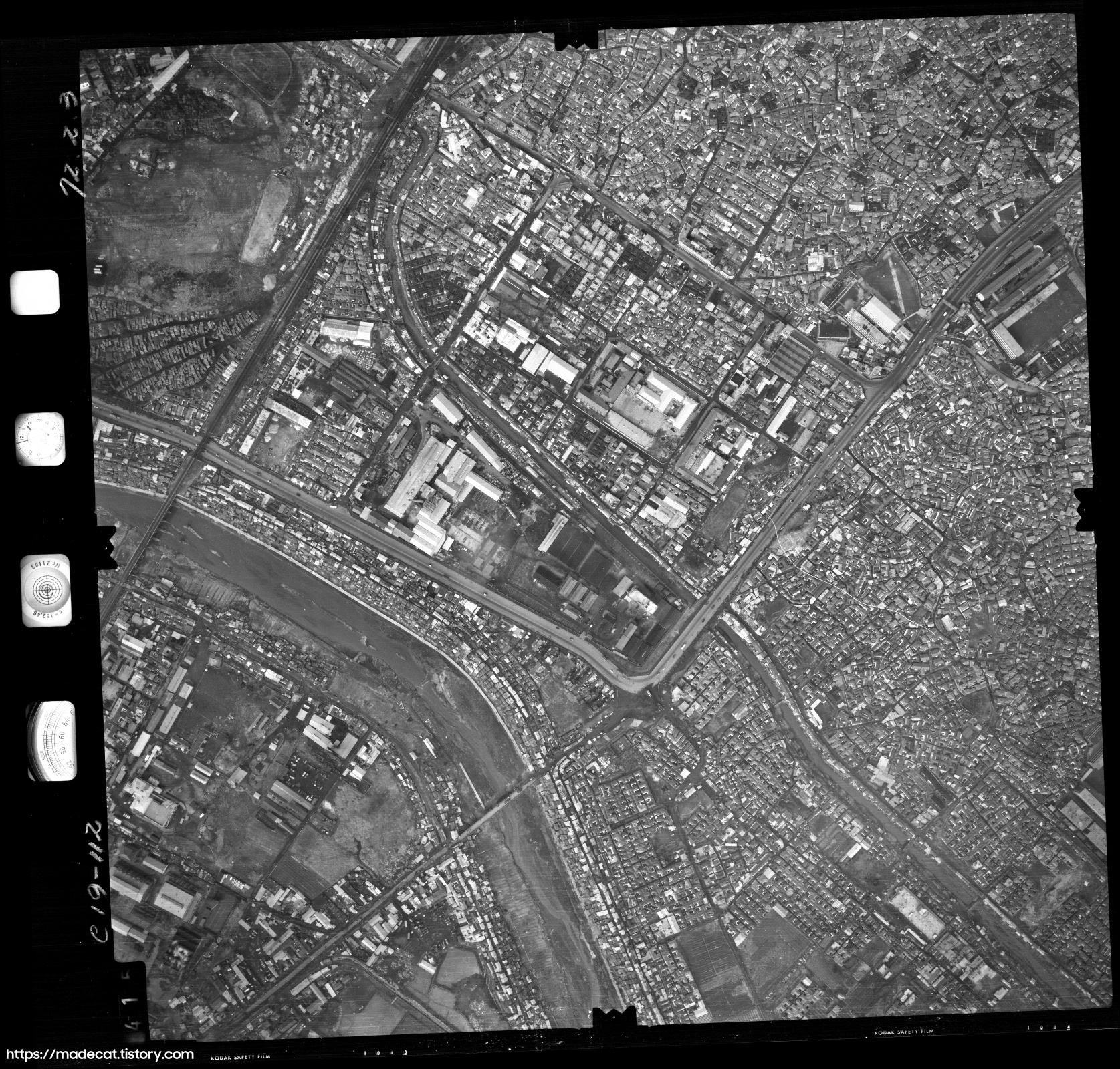 지금은 복개된(황물로) 전농천의 모습도 보이고, 천호대로 자리엔 주택가가 밀집.