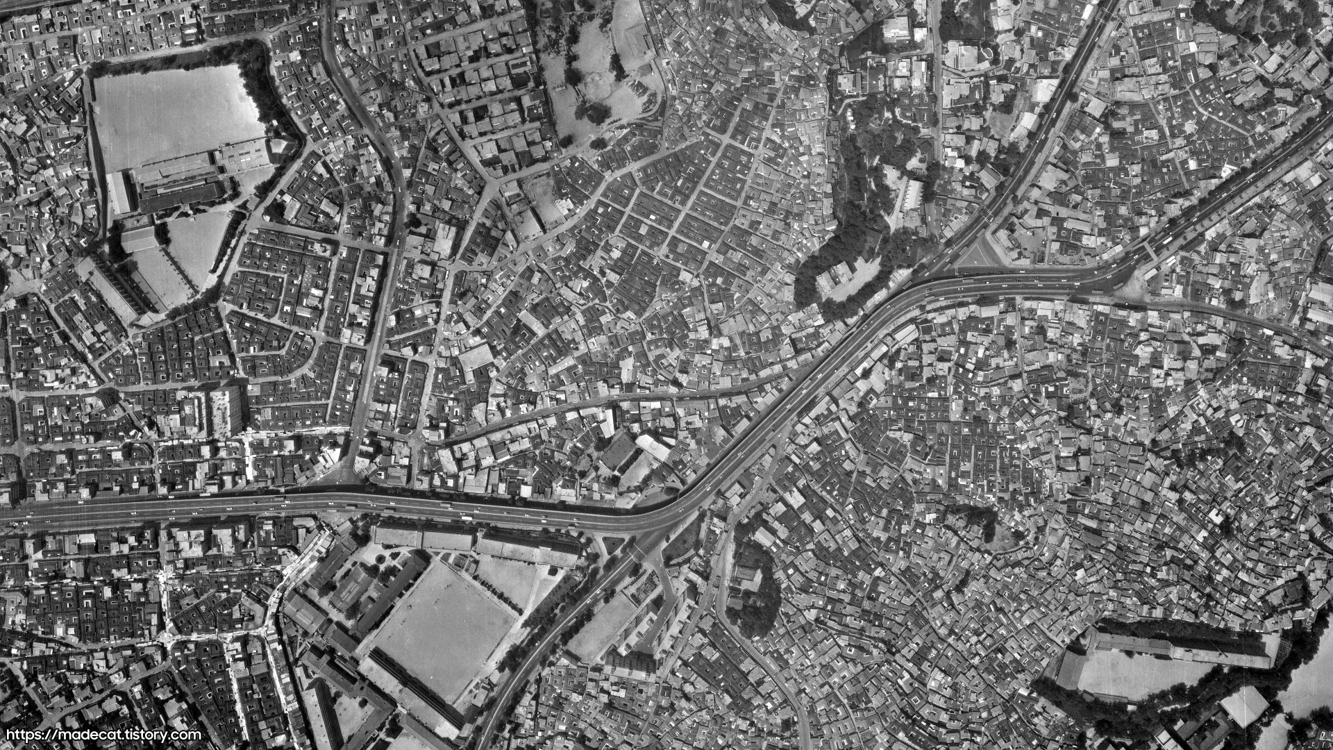 일반 주택 위주로 빽빽히 차있는 아현동 일대와, 4차로에 불과하던 마포대로의 모습이 인상적입니다.